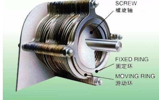 固定環和游動環之間形成的濾縫以及螺旋軸的螺距從濃縮部到脫水部逐漸變小。螺旋軸的旋轉在推動污泥從濃縮部輸送到脫水部的同時,也不斷帶動游動環清掃濾縫,防止堵塞。